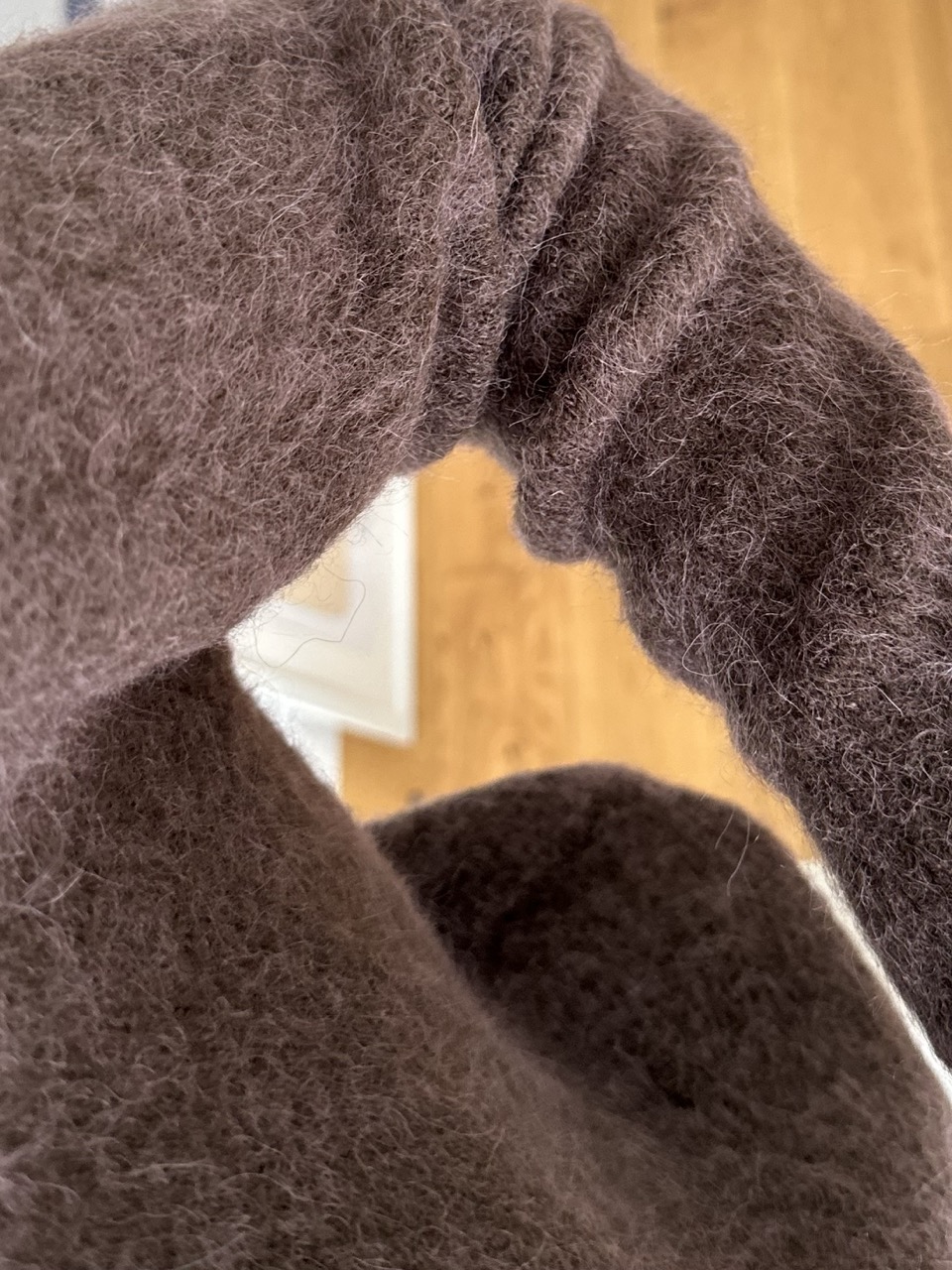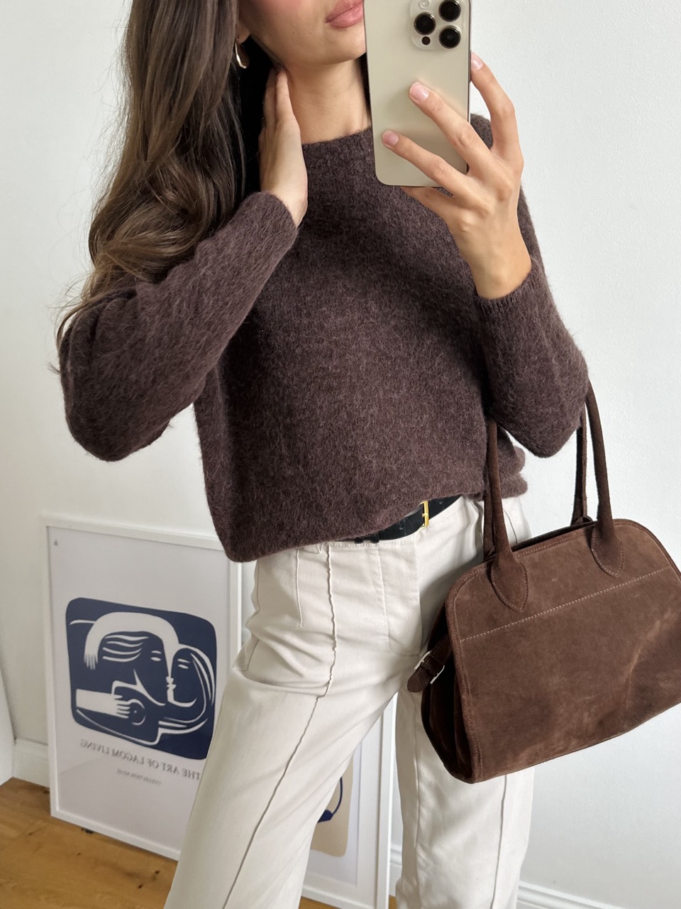 Miękki, puszysty sweter uszyty z baby alpaki i wełny, w odcieniu głębokiego brązu z subtelnym dodatkiem przędzy w kolorze pudrowego różu.