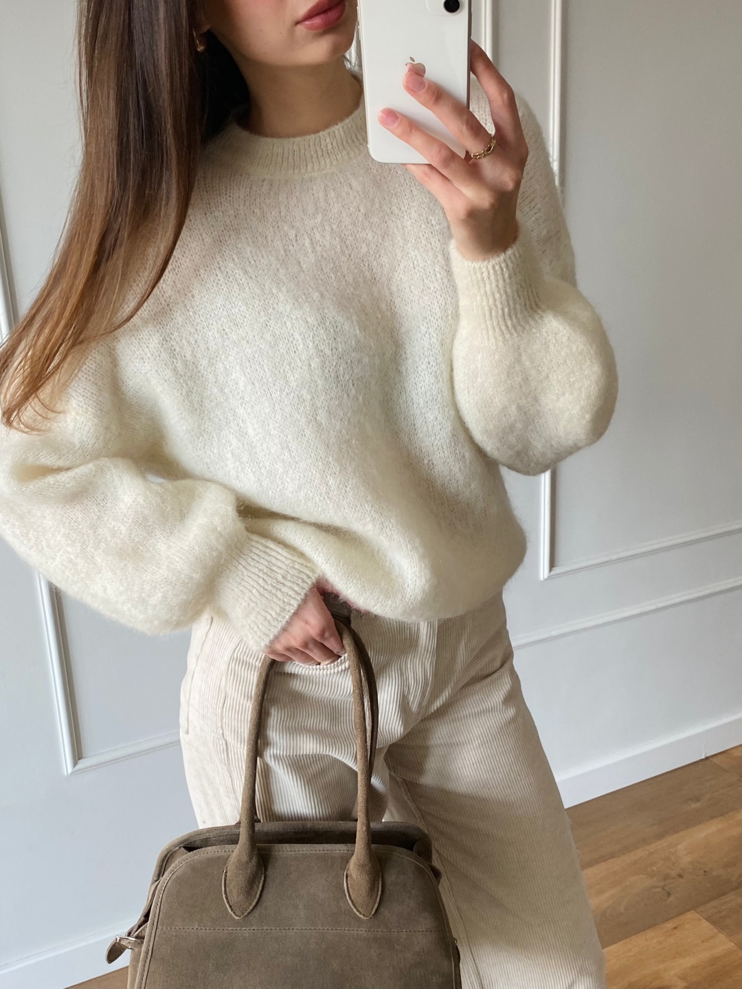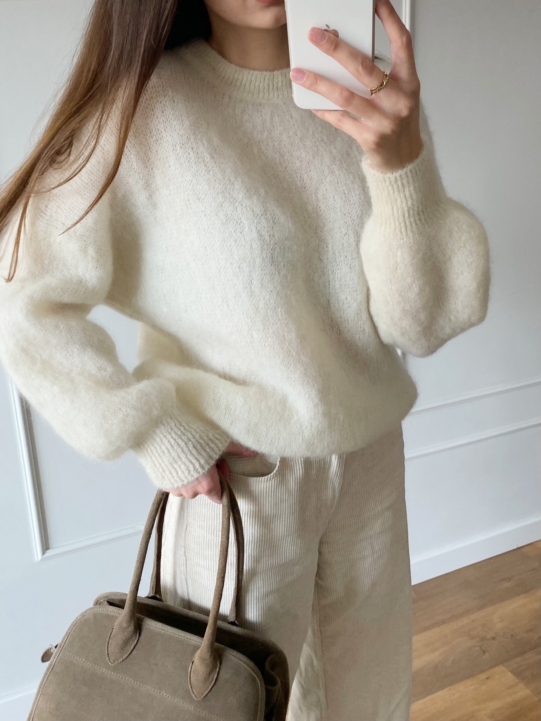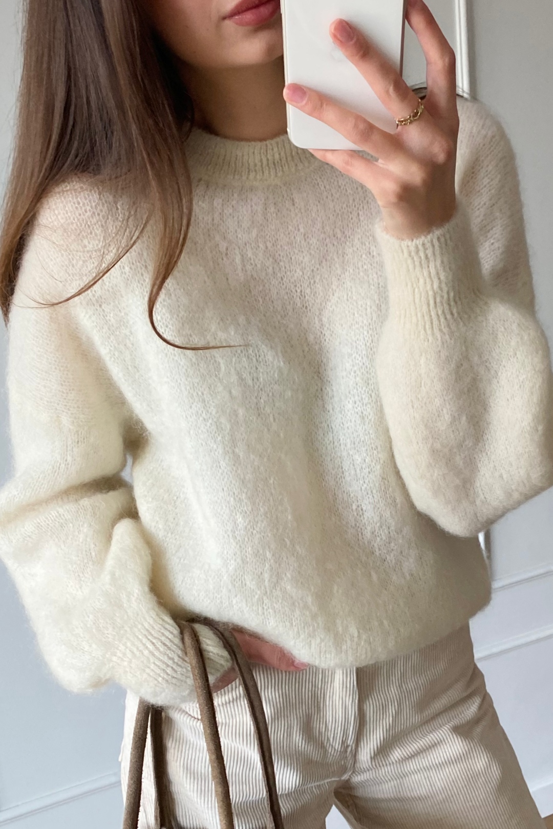 Puszysty, lekki, ciep艂y i przyjemnie mi臋kki sweter. Szerokie r臋kawki zako艅czone 艣ci膮gaczem.
