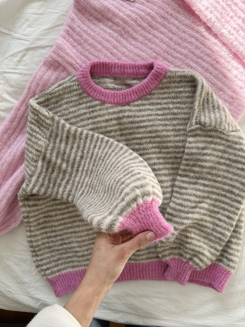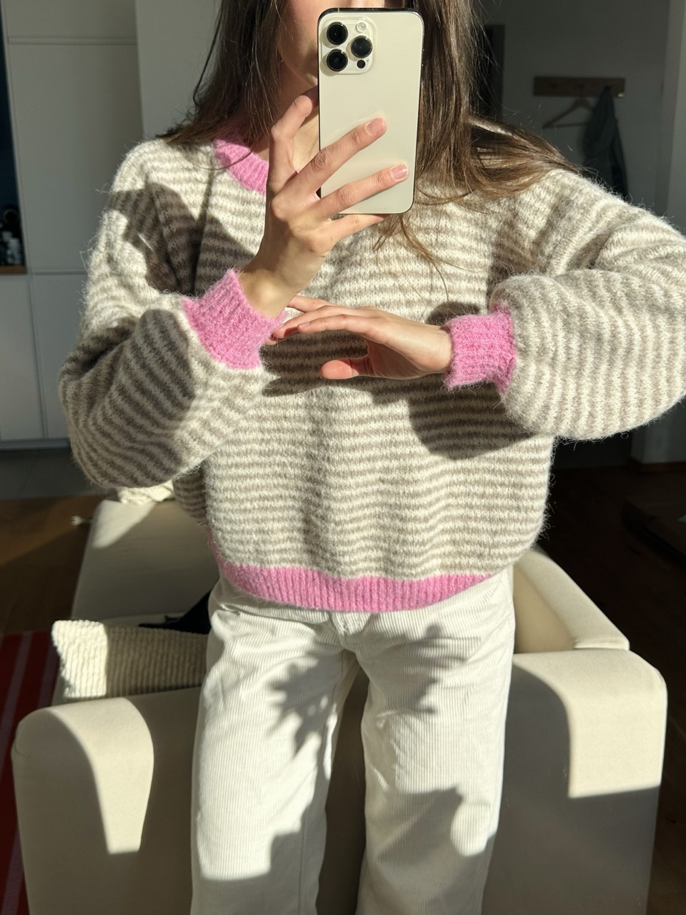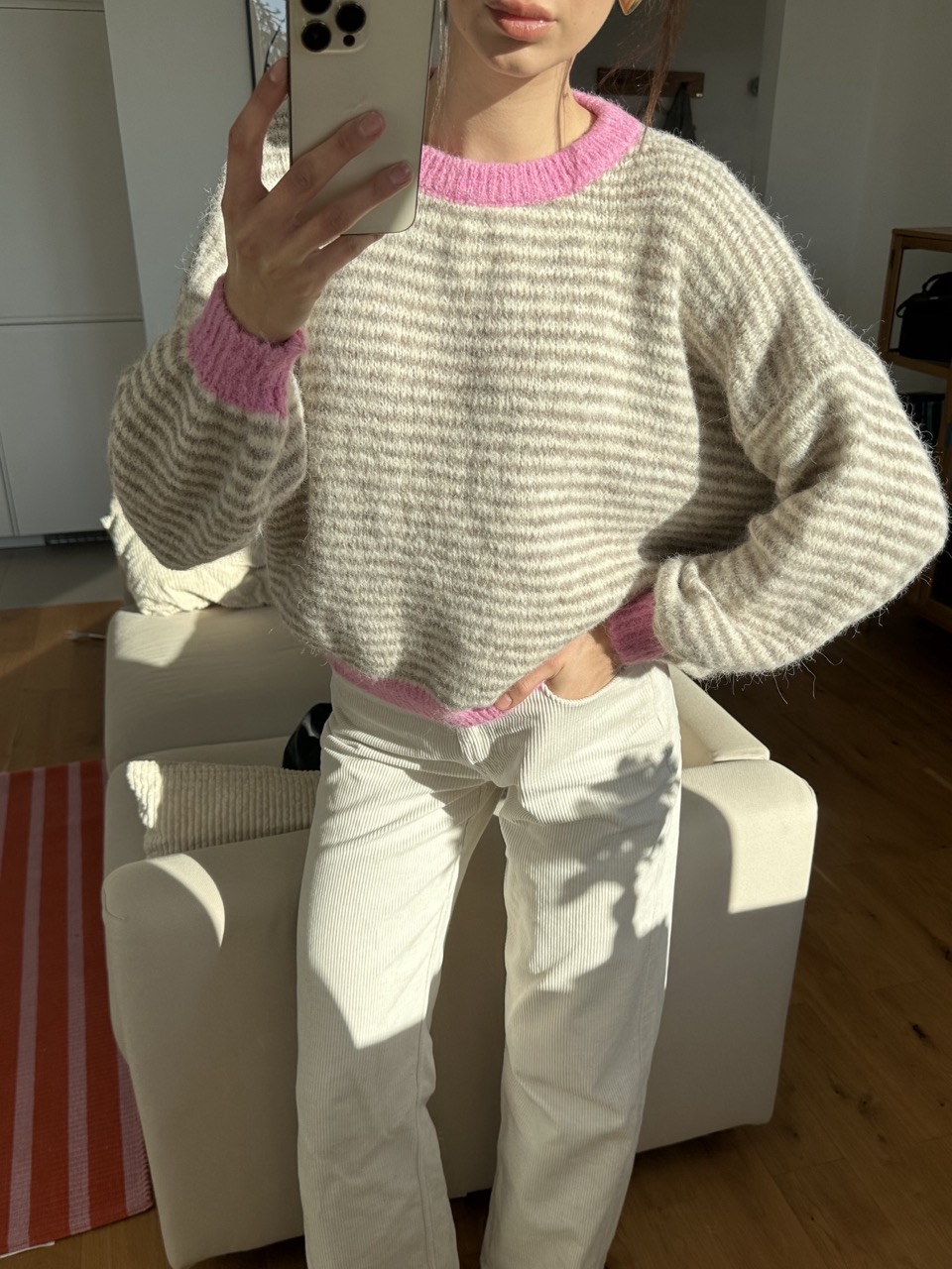 Miękki, puszysty sweter w drobne paski z cukierkowo-różowymi ściągaczami. Oversize’owy, lekko skrócony krój i włoska jakość — idealny statement do jasnych spodni i jeansów.