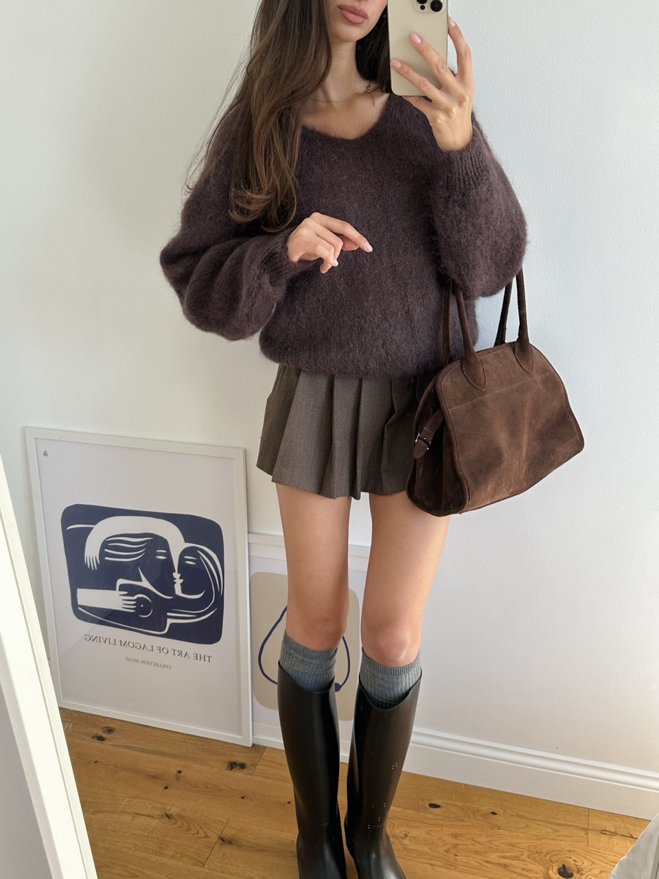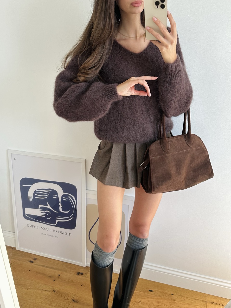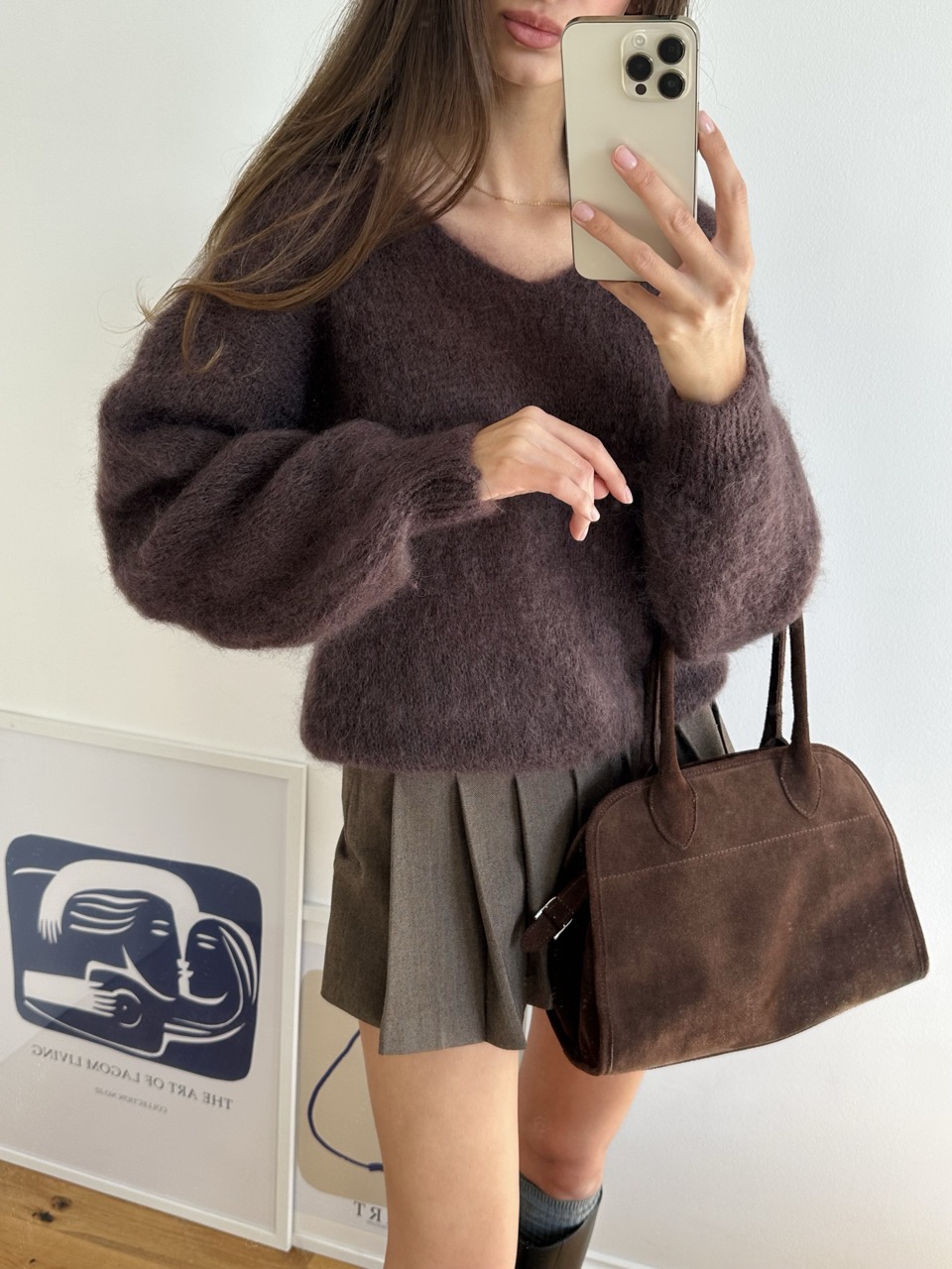 Luksusowy, wyjątkowo miękki sweter z dekoltem w kształcie litery V, wykonany w 80% z delikatnego kid moheru.
