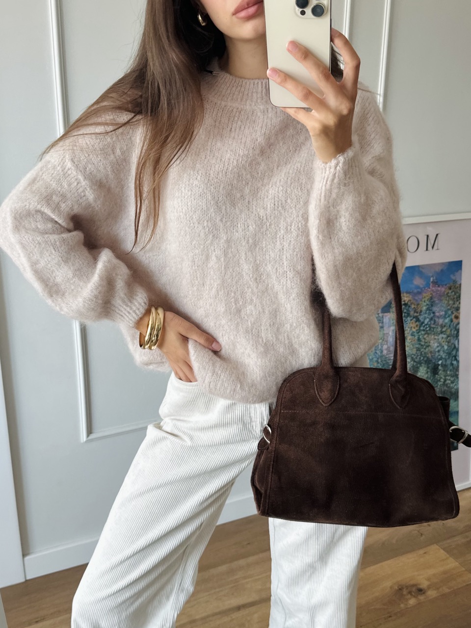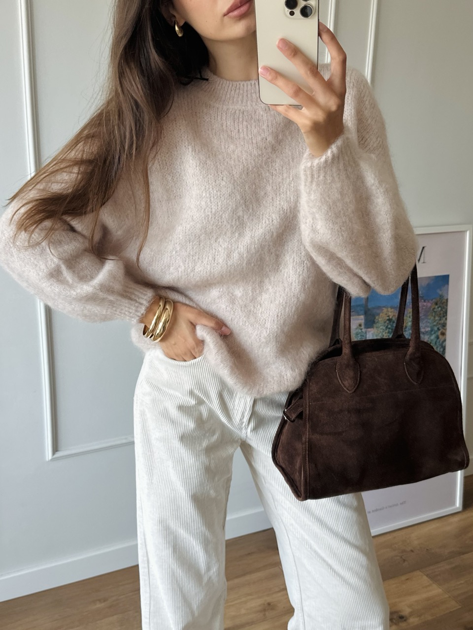 Sweter o pięknym i ciepłym kremowym kolorze, wykonany z włoskiej przędzy z dodatkiem moheru i wełny.
