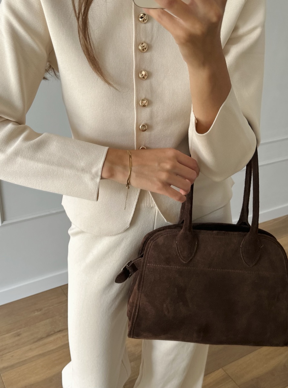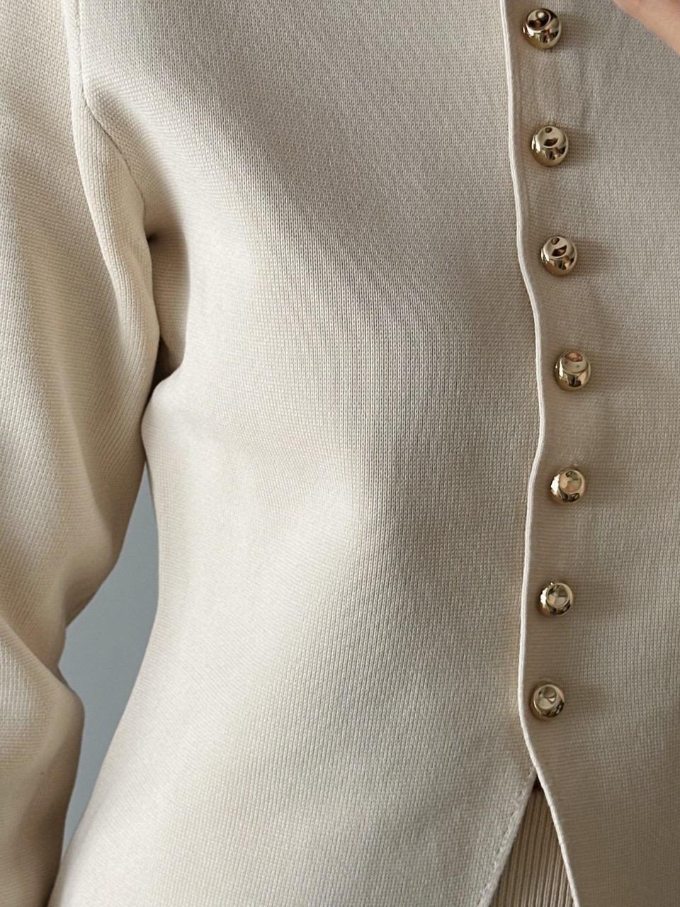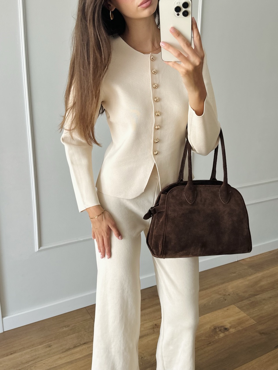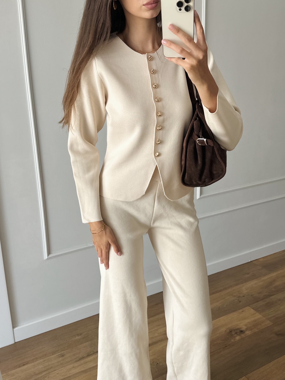 Elegancki i ponadczasowy komplet dzianinowy w kolorze ecru.