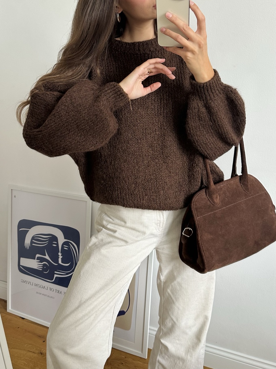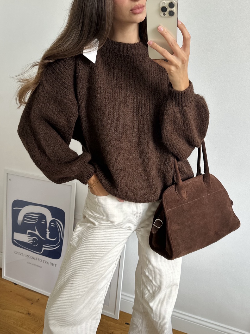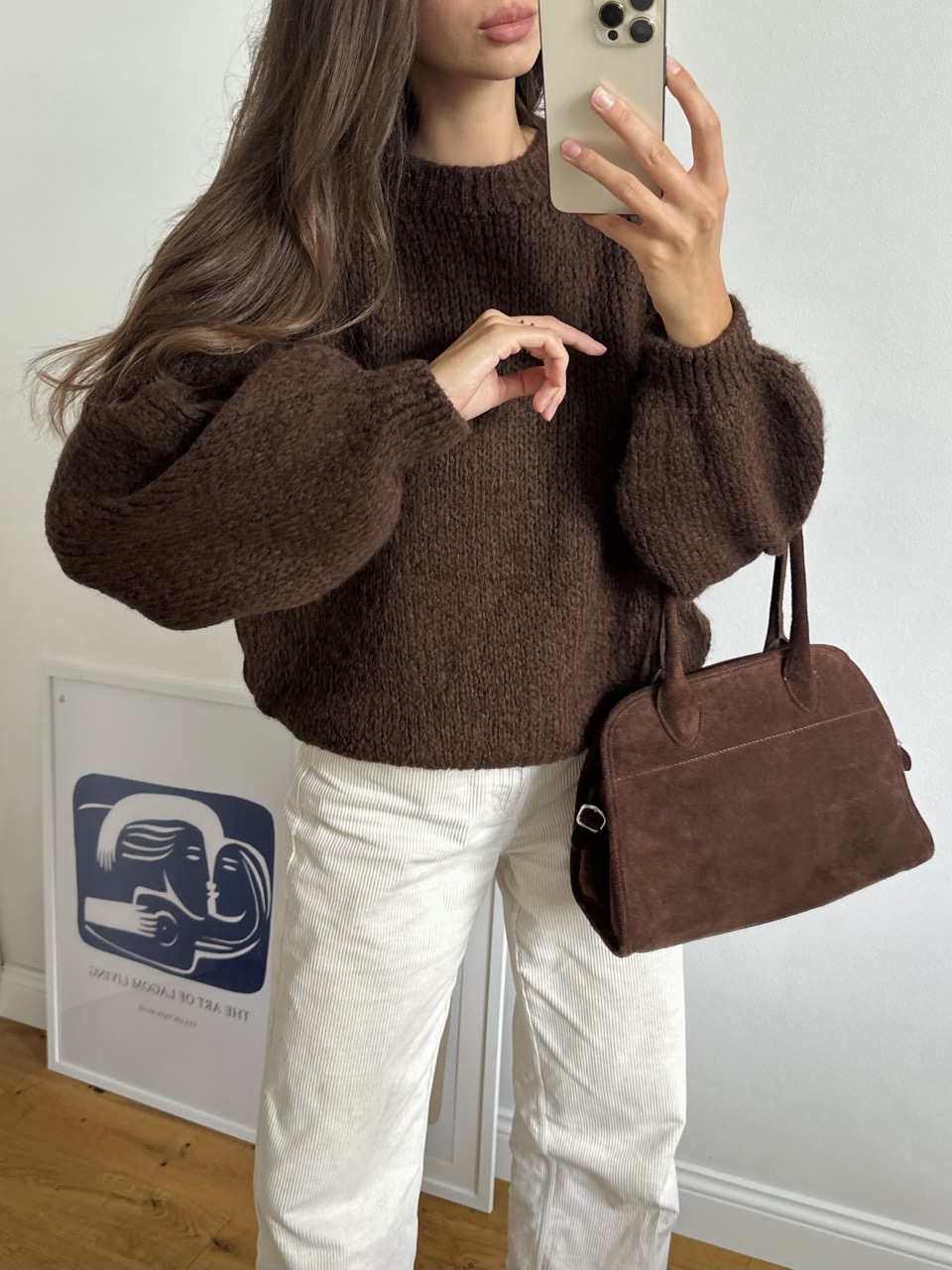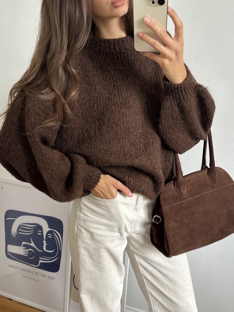 Puszysty, miękki sweter w odcieniu ciepłej czekolady – przytulny, lekki i niezwykle komfortowy.