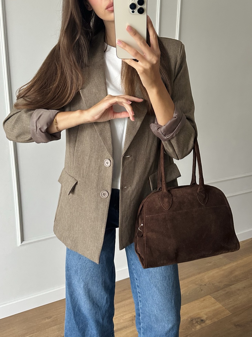 Delikatnie oversize’owy fason z lekkimi poduszkami na ramionach nadaje lekkości sylwetce, a eleganckie klapy w stylu garniturowym dodają całości szyku.