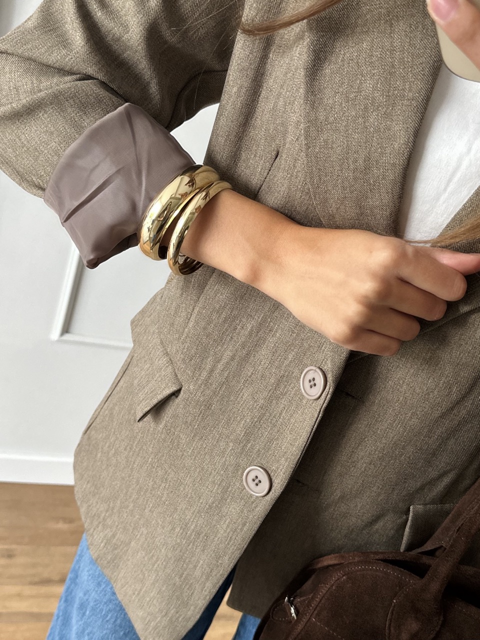 Smart casualowa marynarka w kolorze ciepłego beżu wpadającego w brąz.