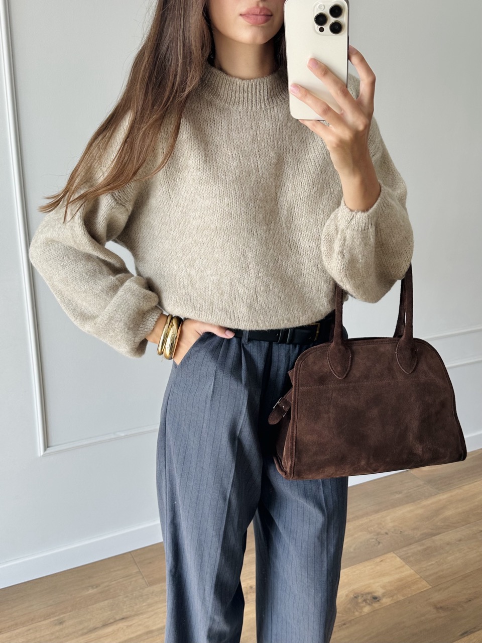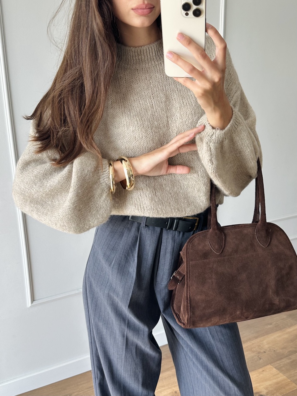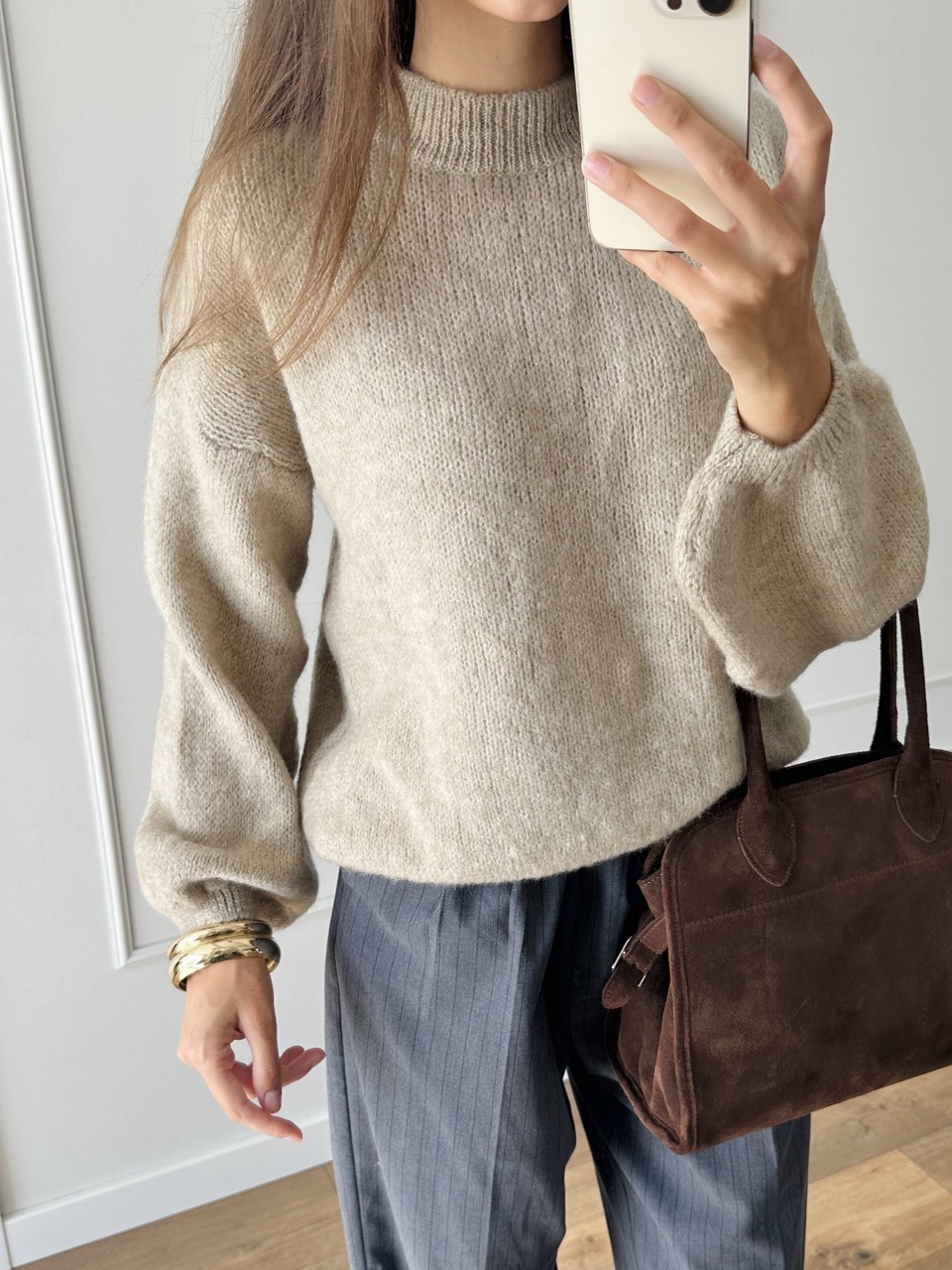 Mi臋kki, klasyczny sweter z domieszk膮 we艂ny i alpaki w 艣licznym odcieniu piaskowego be偶u.