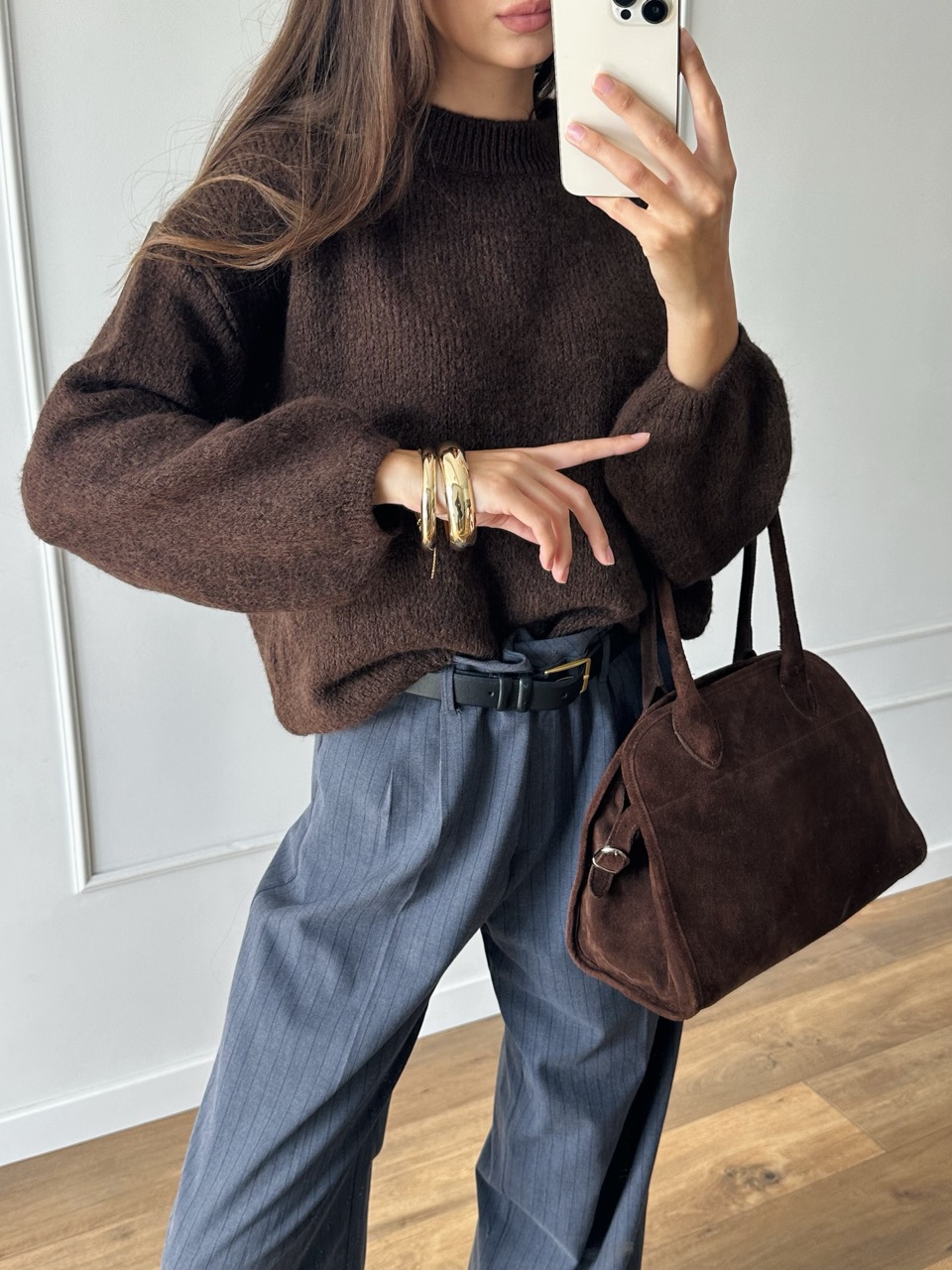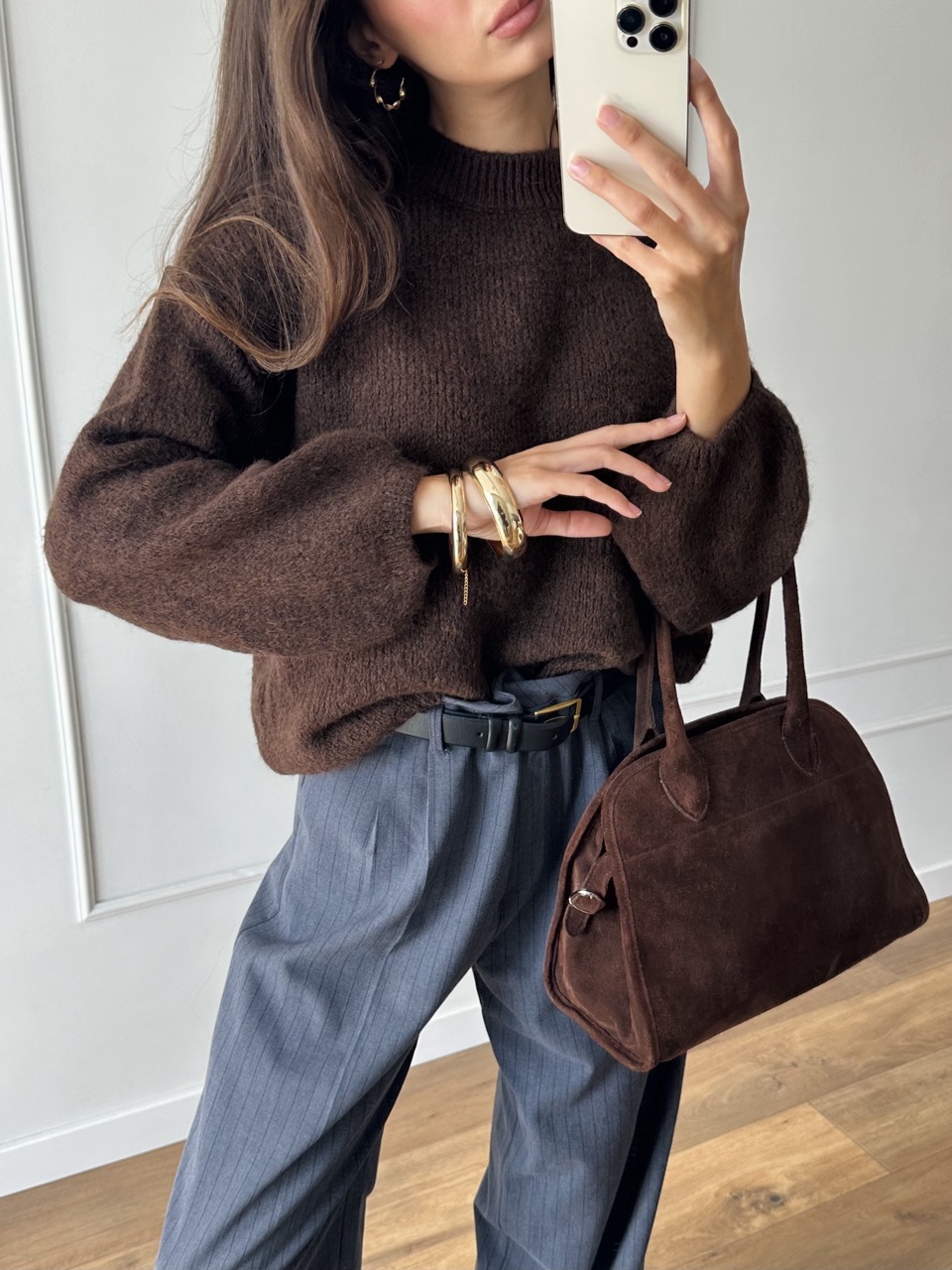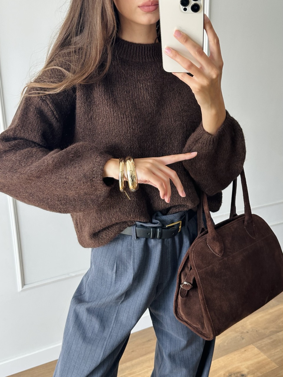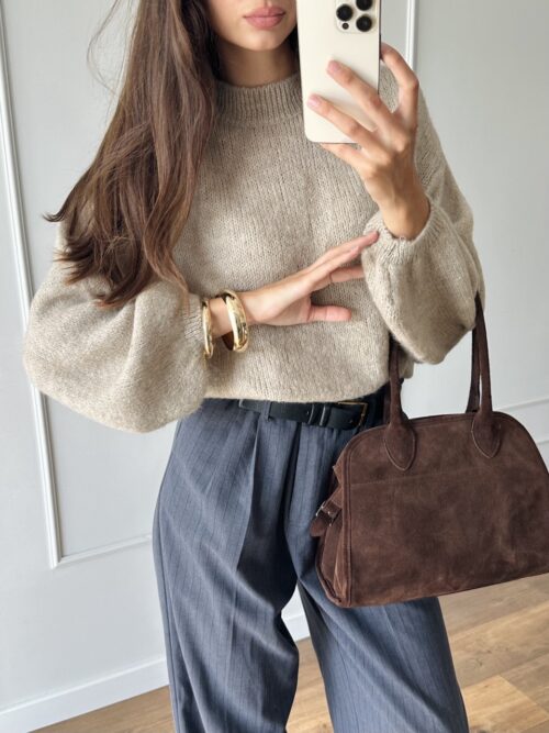 Miękki, klasyczny sweter z domieszką wełny i alpaki w ciepłym odcieniu głębokiego brązu.